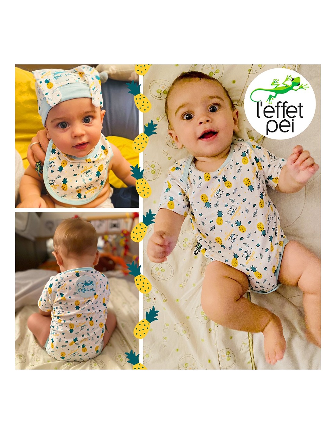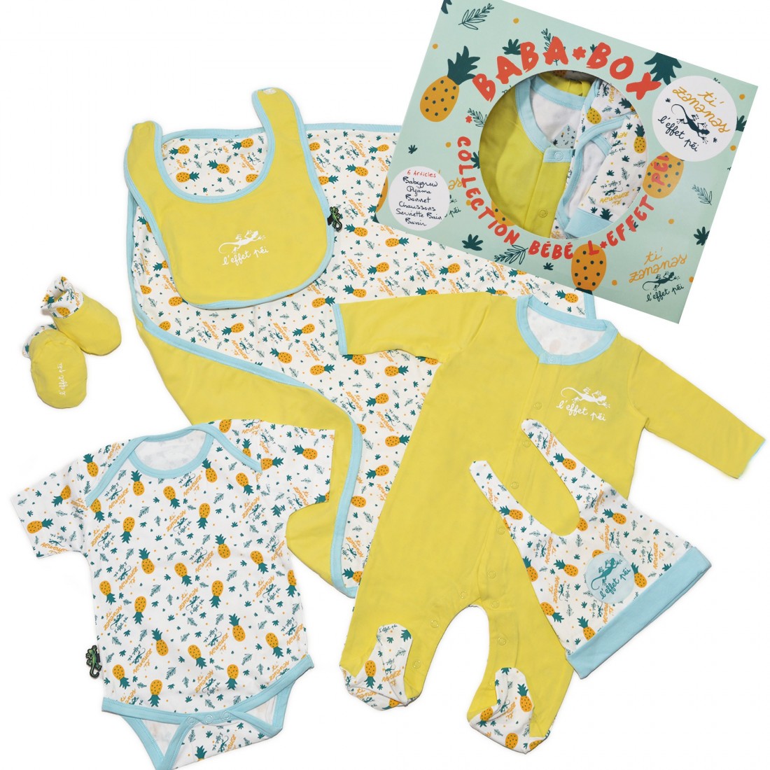 Ensemble BabaBox Ti Zananas / 6 articles : Babygrow Pyjama  Bonnet Chausson Bavoir (Biowashed Lycra Coton) Serviette (220g Finition Peach Lycra Coton)